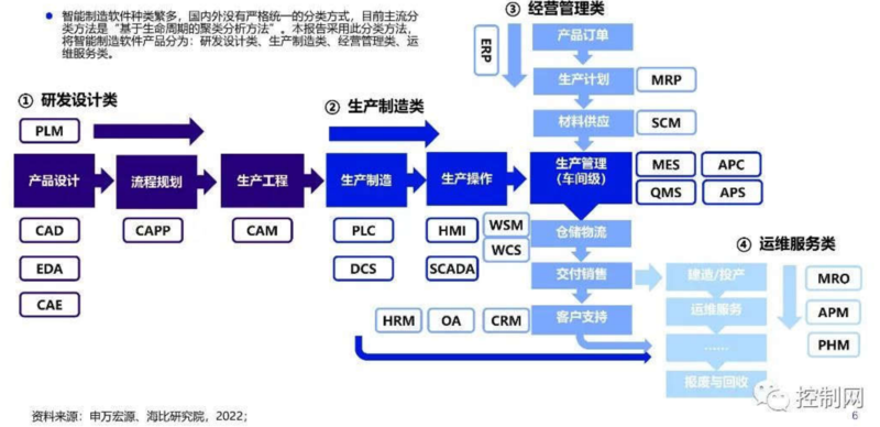 制造全过程的工业软件分布图 【资料来源:申万宏源、海比研究院,2022】 国内对工业软件有好多种分类方法,没有一定之规。通常而言,我门可以按照工业产品生命周期的阶段或环节,大致将工业软件划分为研发设计类软件、生产制造类软件、运维服务类软件和经营管理类软件,这是一种在业界较为常用的聚类划分方法。这种聚类划分方法并不严谨,也并末完整地覆盖工业所有的生命周期(如工厂生命周期、订单生命周期等),即使是产品生命周期,也缺乏前期容户需求和后期产品报废等阶段。鉴于业内约定俗成,频繁使用,因此本文將其作为一种分类方法予以简单介绍: · 硏发设计类:计算机辅助设计(CAD)、计算机辅助工程(CAE)、计算机辅助工艺规划(CAPP)、计算机辅助制造(CAM)、电子设计自动化(EDA)、产品数据管理(PDM)、产品生命周期管理(PIM))等。其中CAD、CAE、CAPP、CAM 、EDA这几种软件,由于需要数学、物理、工程力学、电子等多方面的深度知识而有很高技术门槛,被俗称为“理科类”工业软件。 · 生产制造类:制造执行系统(MES)、制造运营管理(MOM)、可编程逻辑控制器(PLC)、分布式数控(DNC) 、集散控制系统(DCS)、数据采集与监控控制系统(SCADA)、生产计划排产(APS)、环境管理体系(EMS)等。除了APS,这类软件有一定的技术以及工业知识门槛而被称为“工科类“软件,而APS由于其高门槛的算法技术而归为“理科类”。 · 经营管理类:企业资源计划(ERP)、财务管理(PM)、供应链管理(SCM)、客戶管理管理(CRM)、人力资源管理(HRM)、企业资产管理(EAM)、知识管理(KM)等。此类软件技术门槛较低,俗称“商科类”软件。 · 运维服务类:资产性能管理(APM)、维护维修远行管理(MRO)、故障预测与健康管理(PHM)等。 添翼工软的旗舰产品D2M是集工艺规划与管控于一体的工业软件系统,它基本上覆盖了CAPP和MOM的功能。添翼工软的愿景是从D2M出发,逐步将产品系列扩展至工业软件全版图。 声明:此篇为添翼工软原创文章,转载请标明出处链接:https://www.emtob.com/sys-nd/51.html
